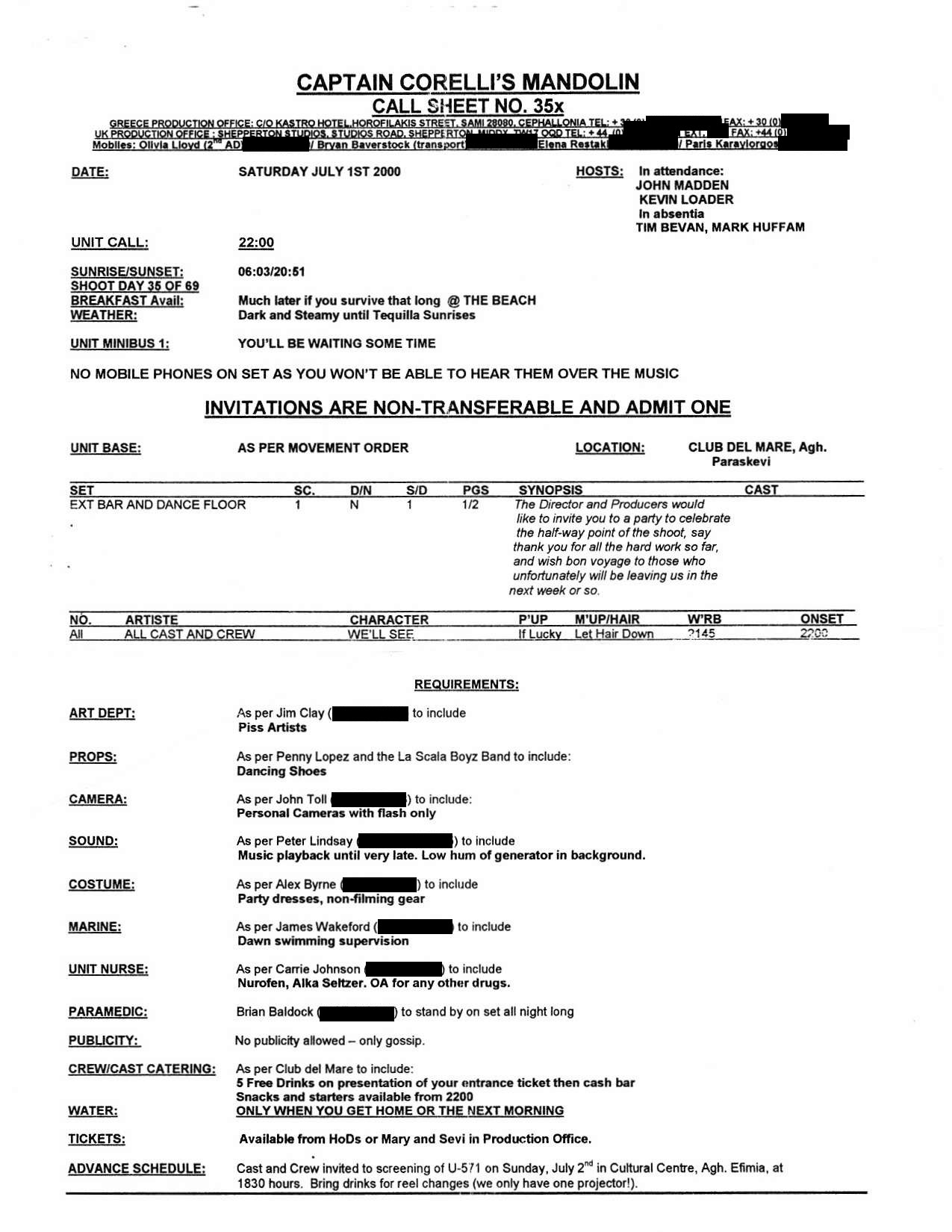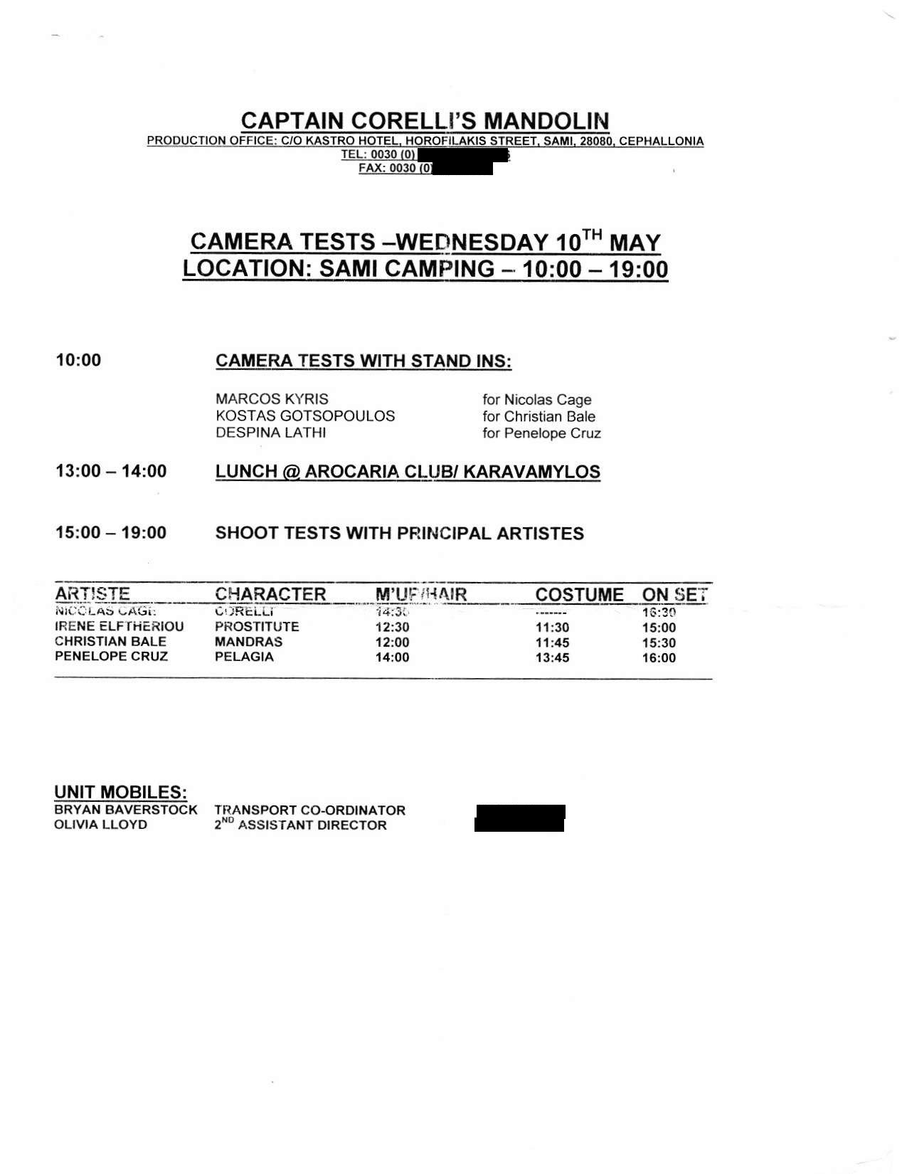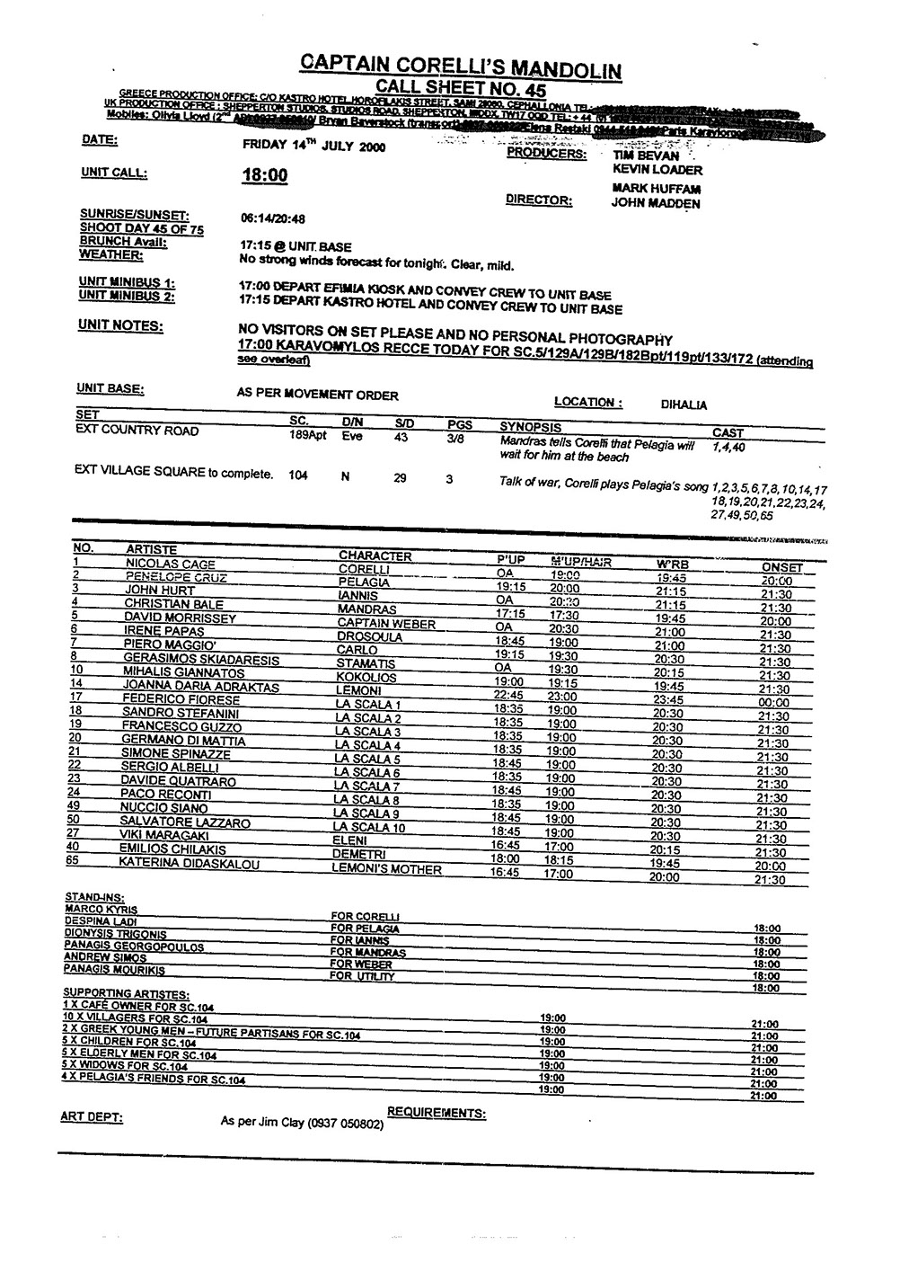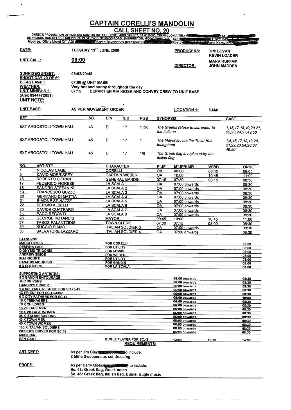 This film was shot on the Greek island of Kefallonia. A small, but green island just west of the mainland. 3 months of heat at 40+C almost did us in. Working straight through the blazing sun, with not a cloud in the sky in military uniforms. A challenge for cast and crew. Tough film to work on despite the glorious Greek effect.