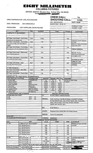 This film was shot in both NY and LA. But the story is based in NY, and state wide too. Lots of moving around by minivans, except in LA. Some great actors to view on the call sheet including James Galdofini (the big teddy bear), Joaquin Phoenix & more. Dark subject, but many of the NC-17 rated shots were cut out in the final edit, but listed on the call sheets. Will release more in time....